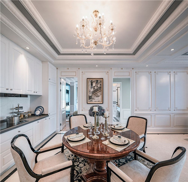 室内装潢以米白色护墙装饰木板与轻柔的灰色壁布搭配,加以精致的古玩、水晶吊灯和装饰壁炉,古典中散发着高贵气息和流金岁月的浪漫情怀;手缝线和以古董行李箱为灵感的抽屉手挽均巧见心思;精美别致的配饰摆件、璀璨夺目的水晶吊灯和装饰性壁炉更添风采。