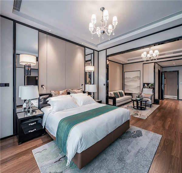 比照五星级酒店的标准,公寓里的床采用了70厘米的床高设计,床垫软度适中,床头软装采用真皮包裹,集品质感和舒适度为一体。