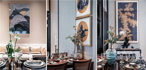 背景墙,以"松竹梅"的枝条、茎干和花瓣为原型,采用激光切割铜色漆面不锈钢制成,趣意倍添。点缀公寓房间的高雅艺术摆设从中国水墨画松树的松枝、毛竹的竹叶及腊梅的花瓣取材,背景墙上有手绘及局部刺绣落排列装饰,倍添新奇趣意;陈设装潢亦不乏松树的主题元素,别具中华情调。
