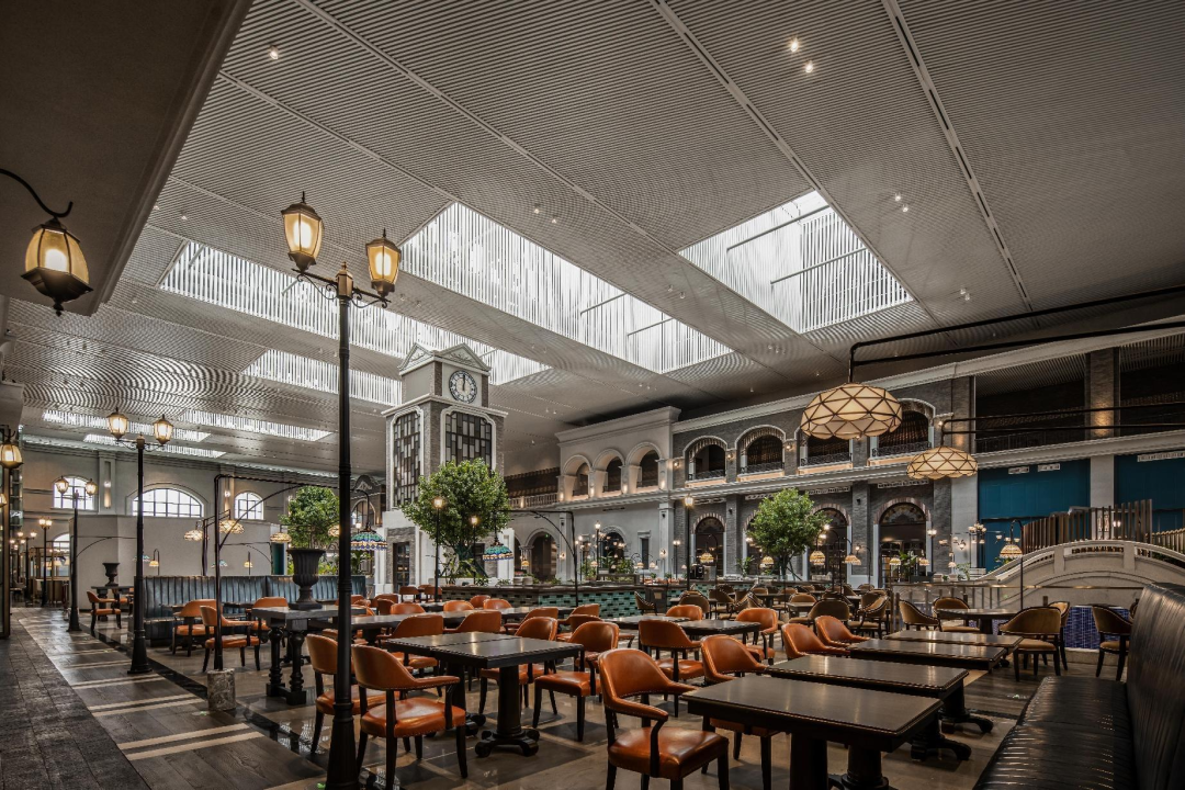 钟楼做为民国时期市中心的一个重要地标,被运用到共享大堂的中心广场位置,广场的设计是民国时代的城市建设缩影,共享大堂做为施柏阁大观酒店与皇冠酒店的大堂吧及全日餐使用,立面上使用软磁材料,塑造民国风立面,打造民国街区,伴随着悠悠的钟声将人民带回那个激荡而浪漫的年代。