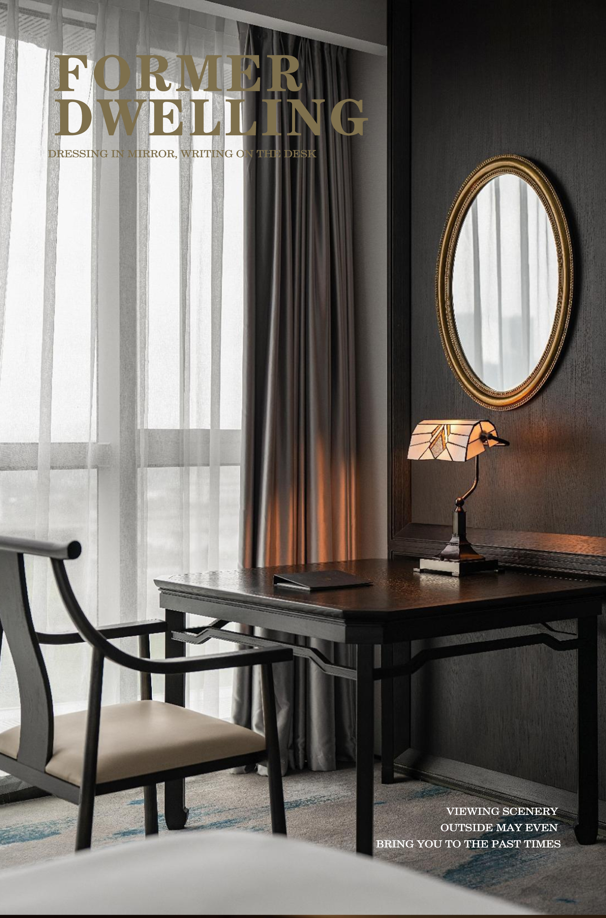 进入客房首先映入眼帘的同样是具有时代感的彩色玻璃,同时墙面的西式线条搭配中式家具,同样诉说着古老东方与西方的相遇。