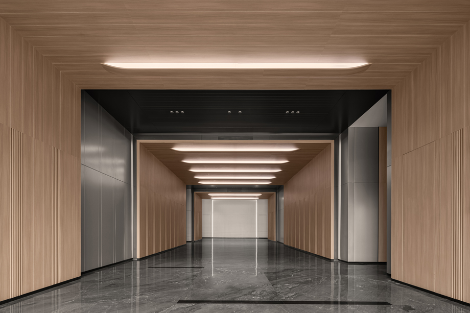 电梯厅的设计融入了轨道元素与中轴对称的理念,延续了设计上的连贯性与深度。天花板设计以大气与简洁为核心、整体感强烈,减少不必要的装饰元素,强调空间的纯净与秩序,营造出一种既开阔又精致的视觉效果。