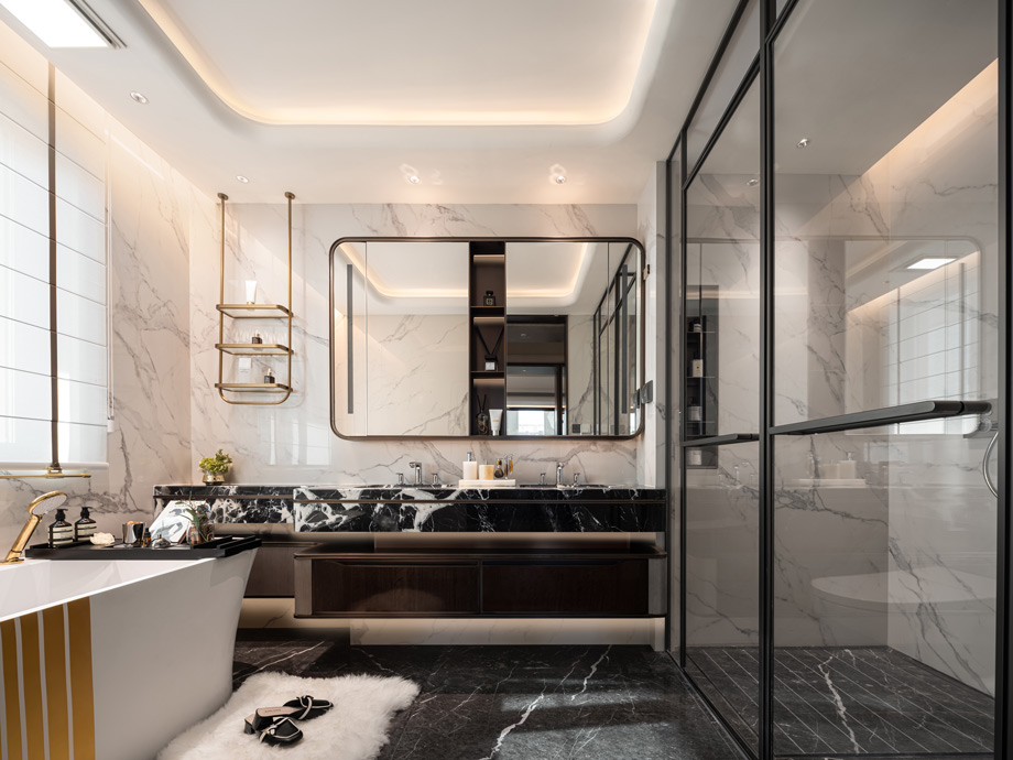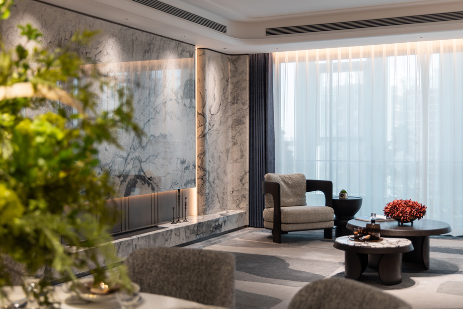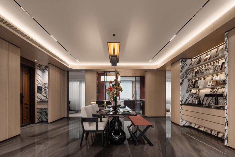 宝格丽岩板凹龛如艺术展台,木饰面与金属收边低调中彰显质感,智能可视系统则暗藏科技的温度。