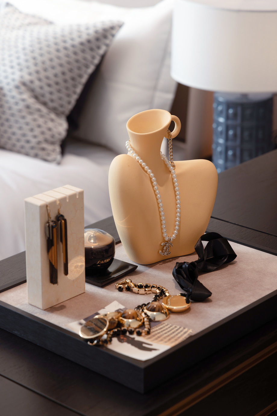 L形转角衣柜以皮革与金属镶边,兼具收纳与展陈功能;飘窗台化身迷你茶席,晨光微曦时,一杯清茶、一本闲书,便是诗意生活的注脚。